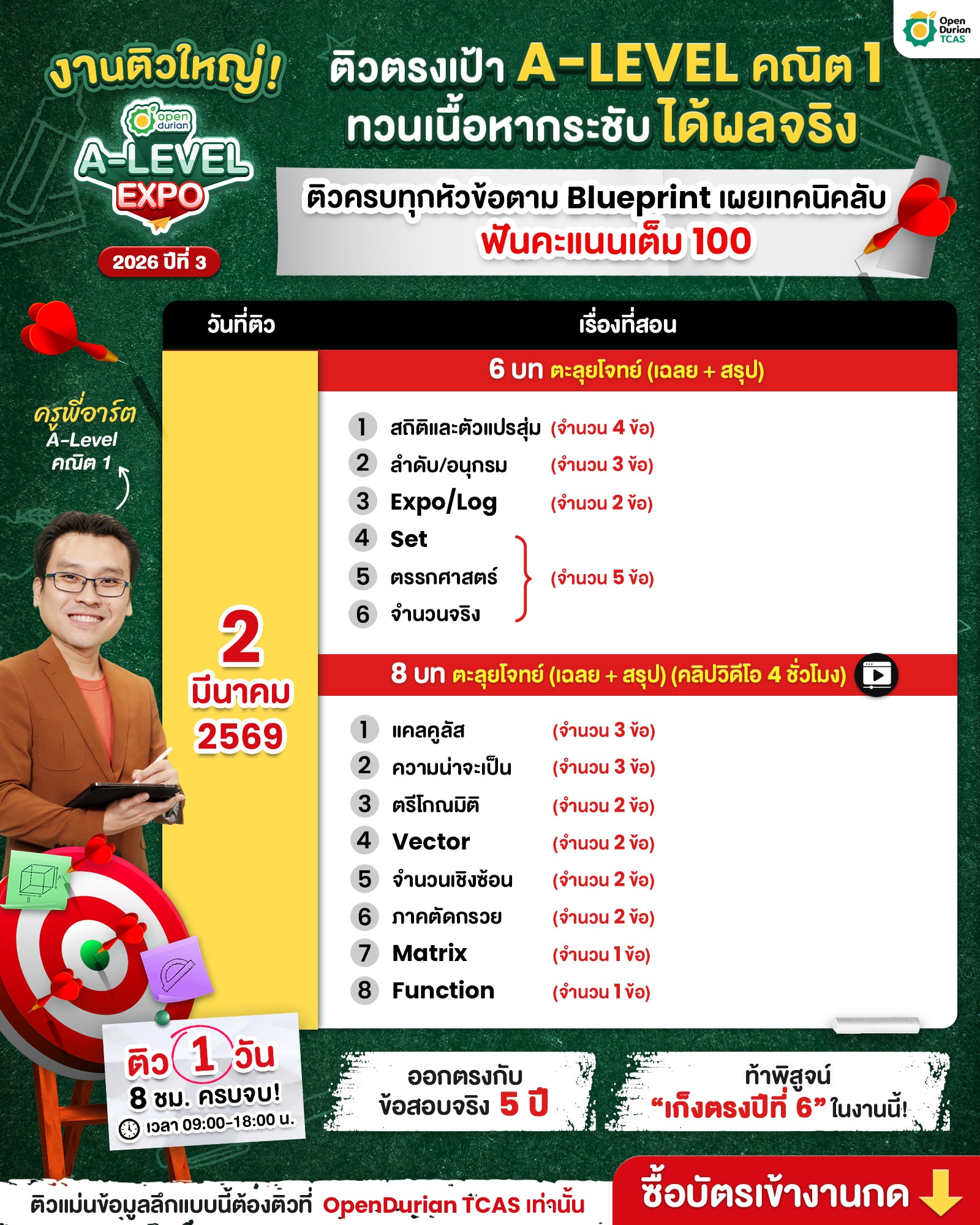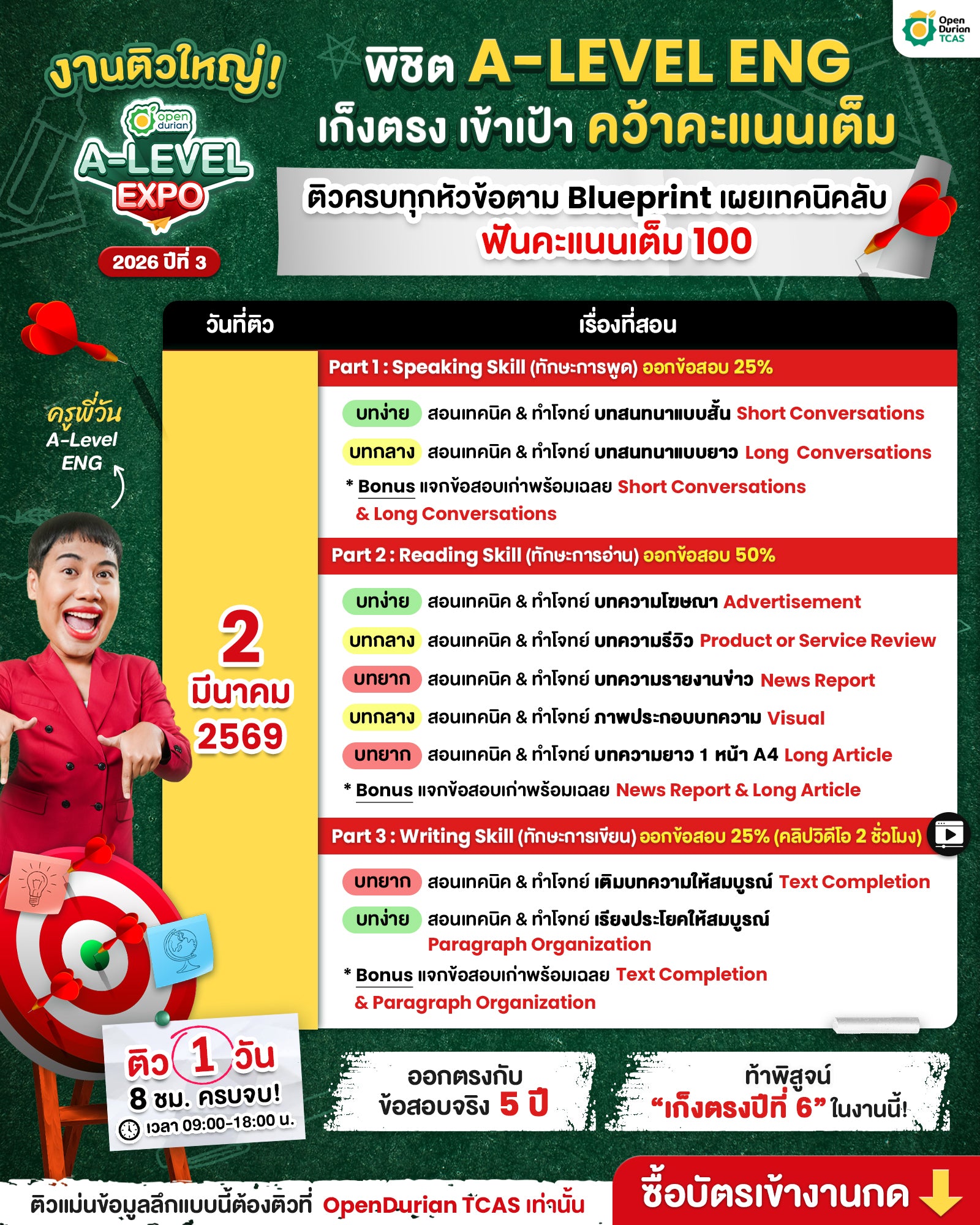 งานติวสอบตะลุยโจทย์ OpenDurian TCAS A-LEVEL EXPO 2026 ปีที่ 3 ครบทุกเนื้อหาตาม Blueprint เผยเทคนิคลับเก็บคะแนนเต็ม